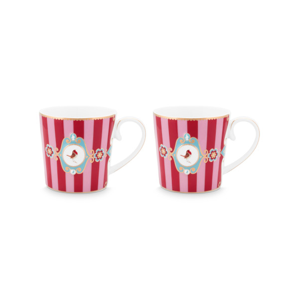 Pip Studio – 2er Set – Mug Large – Becher / Tasse – Love Birds Medaillon Stripes red-pink 250ml